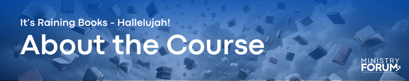 Welcome to "It's Raining Books," a unique offering from the Ministry Forum. This course is dedicated to all things books. In "It's Raining Books," participants will immerse themselves in a vibrant community where books are celebrated and explored in various engaging formats.